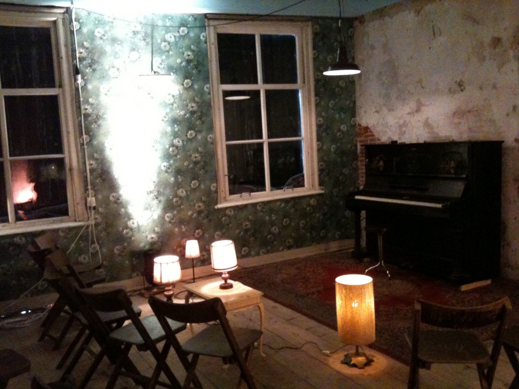 Sfeervol warm podium ingericht voor vanavond Vanavond belooft een bijzondere avond te worden, want vanavond speelt Savina Yannatou in de voorkamer van Rood|Noot.